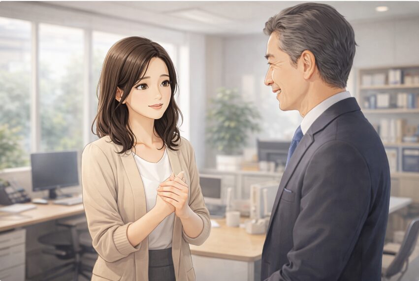 話すときは、デスク越しであっても一度立ち止まり、しっかりと相手の目を見て話します。もし座っている相手に対して話しかける場合は、中腰になるなどして目線の高さを合わせると威圧感がなく丁寧です。名刺入れやお祝いの品を渡すときは、必ず両手を添えましょう。