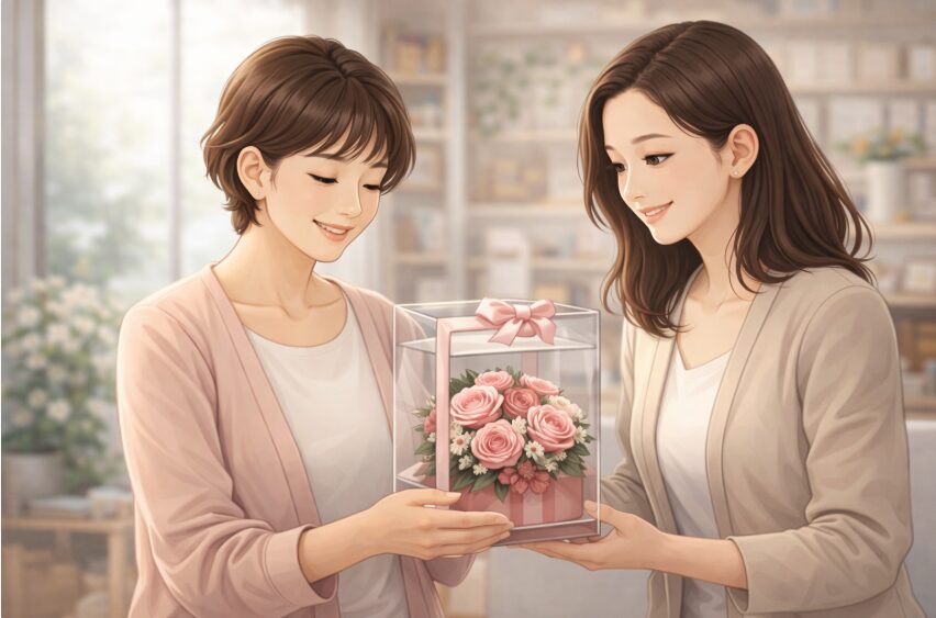 プリザーブドフラワーは水やりの必要がなく、長期間美しい状態を楽しめるため、記念品として飾っておくのに最適です。また、ボックスフラワーであれば、箱に入っているため持ち運びが楽で、そのまま置いて飾れる利便性があります。