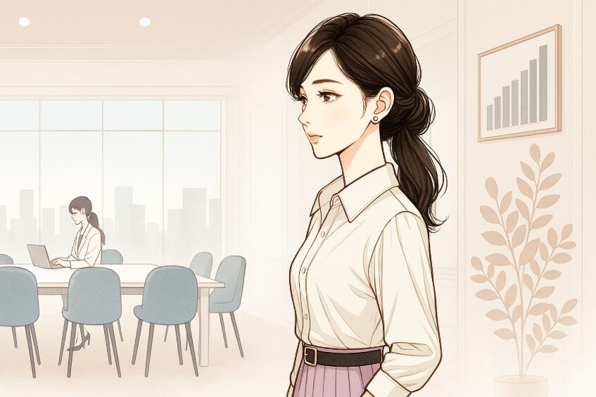 職場で好感度の高いヘアスタイルの共通点は、清潔感があり、顔周りがすっきりしていることです。肩につくくらいのボブスタイルや、上品に見えるハーフアップ、そして落ち着いた大人の女性を演出する低めの位置でのまとめ髪(シニヨンなど)は、どんな職種でも間違いのない選択です。